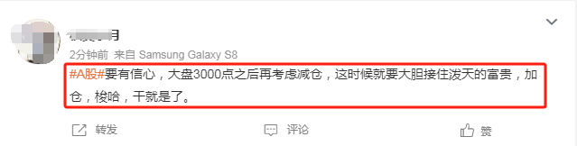 也有投资者指出,“要有信心,大盘3000点之后再考虑减仓,这时候就要大胆接住泼天的富贵。”同时,该投资者表示,“加仓,梭哈,干就是了。 ”