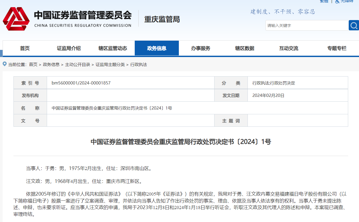 【大河财立方消息】2月21日消息,重庆证监局日前披露的一份行政处罚决定书显示,该局对于勇、汪文政两位自然人内幕交易福日电子股票一案进行了立案调查、审理,决定对上述两位自然人进行处罚,其中对汪文政没收违法所得1586万元,并处以4757万元罚款,罚款加上没收款项合计超过6000万元。