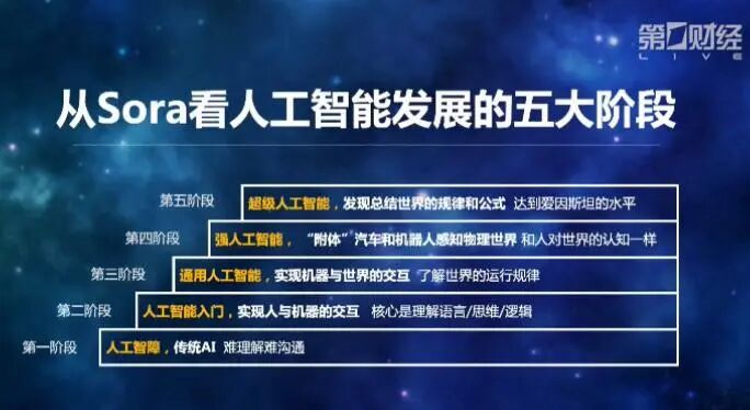 此外,周鸿祎提出从Sora看人工智能发展的五个阶段。他认为,第一阶段是传统AI。第二阶段,人工智能实现了入门,实现了人与机器的交互。第三阶段,实现机器与世界的了解,基本实现基础的通用人工智能。第四阶段,基本进入强人工智能。最后,如果人工智能能总结公式,像爱因斯坦一样能够推理出相对论,那么就成了超级人工智能。