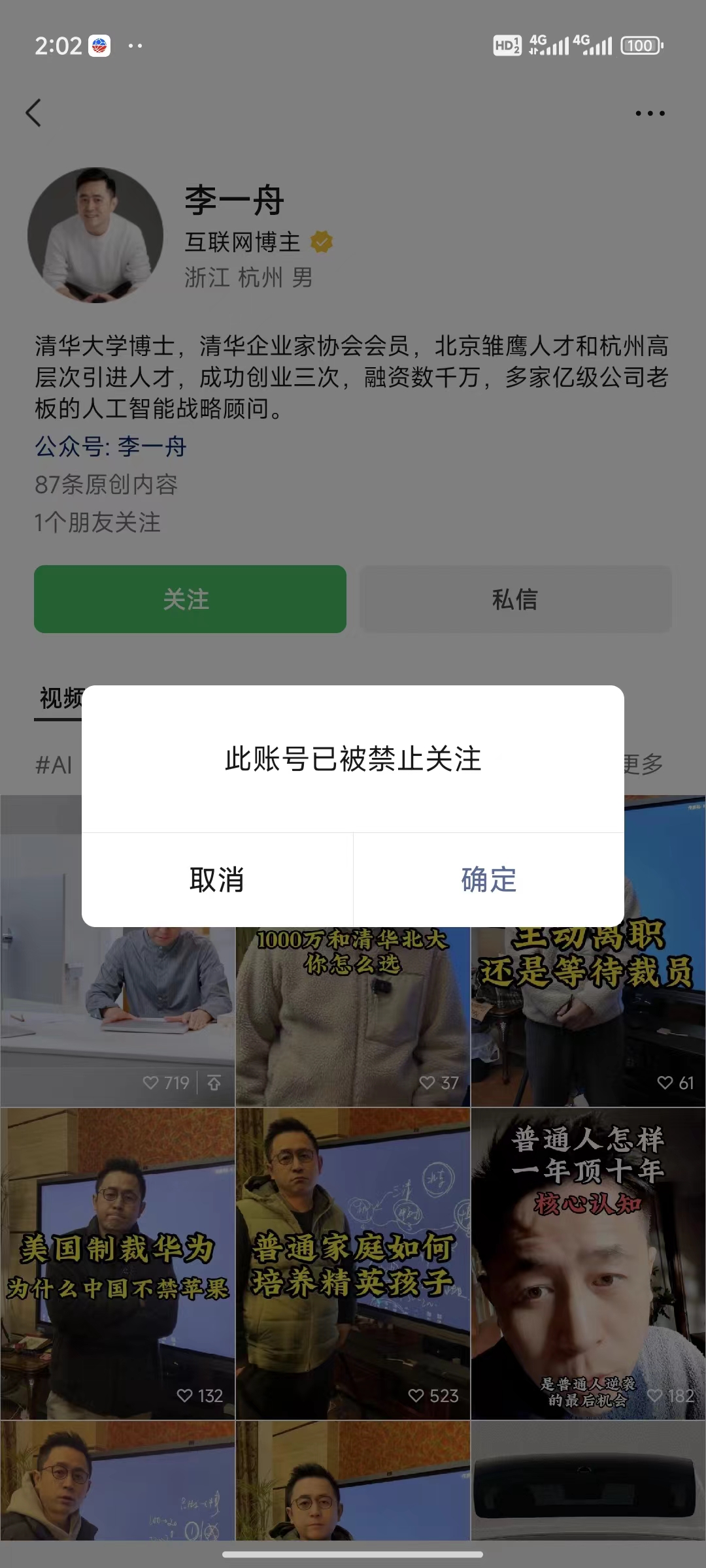 记者还发现,李一舟的个人视频号现已被禁止关注。不过,其官方视频号“李一舟AI”仍然可以关注。