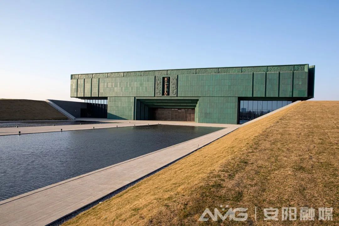 殷墟博物馆新馆坐落于洹水之滨、殷墟之上,与殷墟宫庙遗址隔河相望,是首个全景式展现商文明的国家重大专题博物馆,由华南理工大学工程院院士何镜堂院士担纲设计。整个建筑以《诗经·商颂》为源,以绿野草台、鼎立大地、层叠深邃、青铜装裹为形,以绿色低碳、可持续的发展模式为要,在洹河之畔破土而出,形成具有考古学意义的“中华之范、文明圣殿”。新馆展陈设计聚焦“伟大的商文明”这一主题,设有3个基本陈列、4个专题展览和1个特色沉浸式数字展。