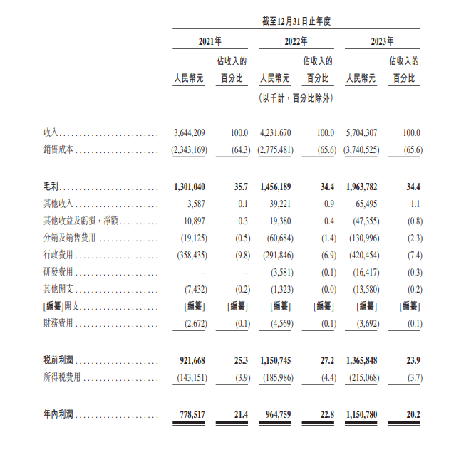 2021~2023年,茶百道收入分别为36.44亿、42.32亿、57.04亿元,毛利分别为13.01亿、14.56亿、19.64亿元,同期毛利率分别为35.7%、34.4%及34.4%。应占年内利润及全面收益总额分别为7.79亿、9.65亿元、11.51亿元。净利润率分别为21.4%、22.8%、20.2%。