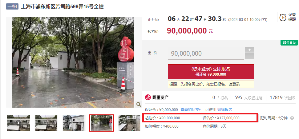 阿里拍卖平台显示,位于上海市浦东新区芳甸路599弄15号的全幢别墅被上海市第一中级人民法院司法拍卖。该房屋评估价为1.27亿元,起拍价9000万元,将于3月4日起拍。
