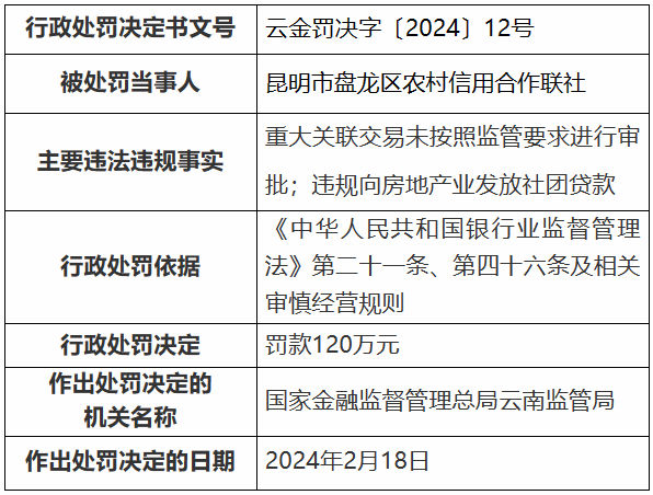【大河财立方消息】2月26日消息,昆明市盘龙区农村信用合作联社因重大关联交易未按照监管要求进行审批、违规向房地产业发放社团贷款,日前被国家金融监督管理总局云南监管局处罚款120万元。