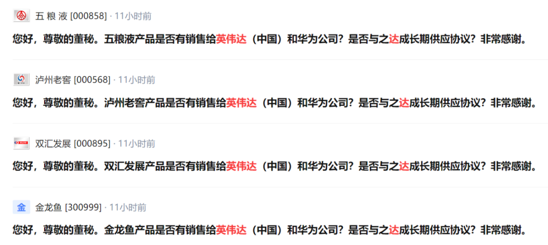 无独有偶。另一位投资者在互动平台先后向五粮液、泸州老窖、双汇发展、金龙鱼等食品饮料上市公司提问,询问公司产品是否有向英伟达(中国)和华为公司销售以及达成长期供应协议。截至发稿,上述公司尚未作出回应。