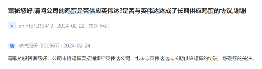 晓鸣股份对此回应称,未将鸡蛋直接销售给英伟达公司,也未与英伟达达成长期供应鸡蛋的协议。
