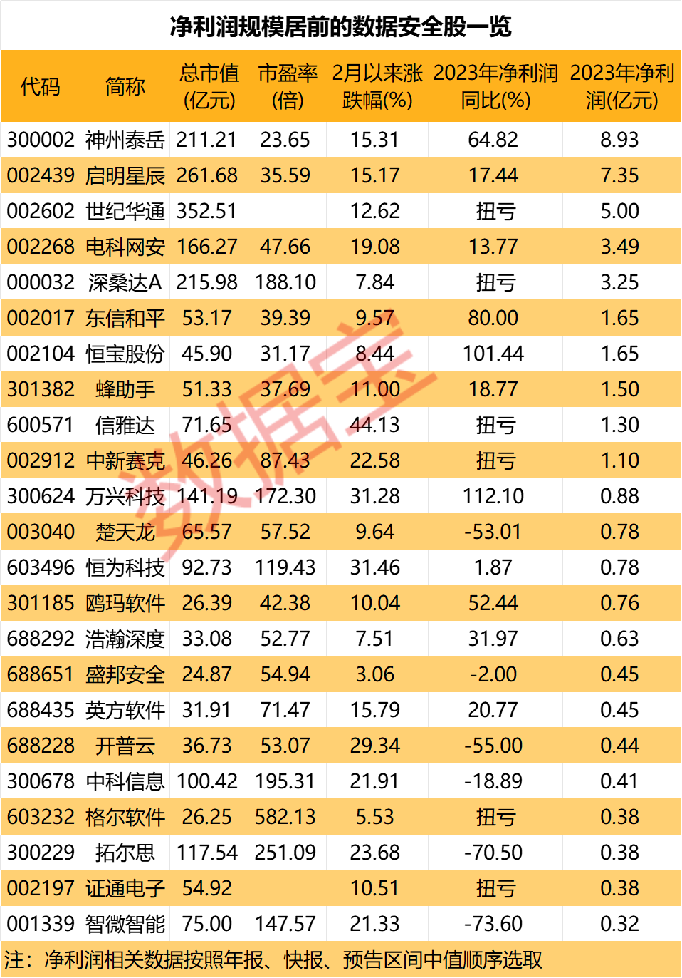 证券时报·数据宝统计,以年报数据或预告区间中值统计,2023全年净利润规模在3000万元以上的数据安全股共计23只。其中,净利润规模最大的5家公司为神州泰岳、启明星辰、世纪华通、电科网安和深桑达A。