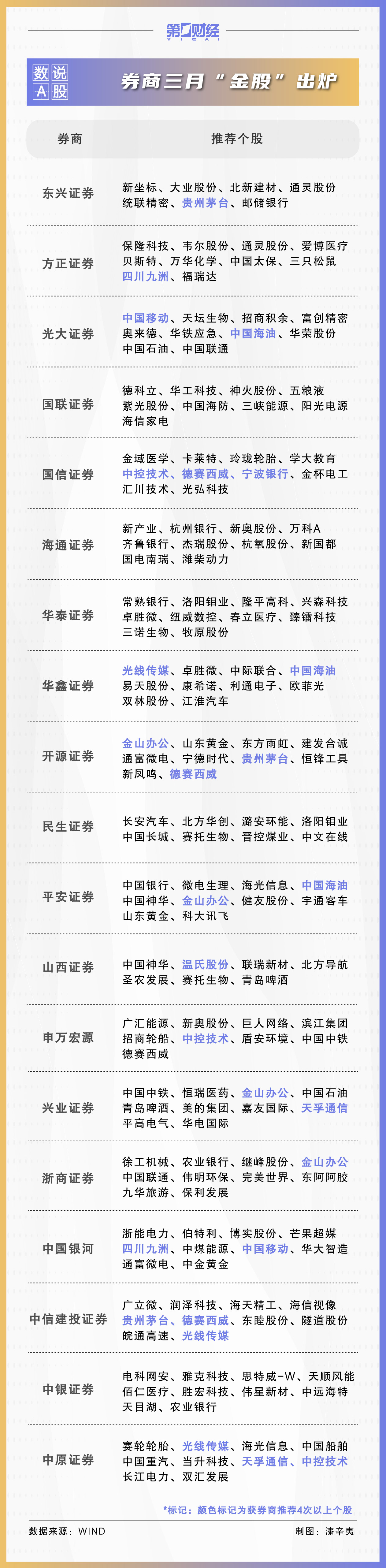 2月市场全面回暖,上证指数月内收涨8.13%。3月如何寻找机会?截至3月1日,有超20家券商公布了3月月度投资组合,涉及消费、金融、科技等多个领域。