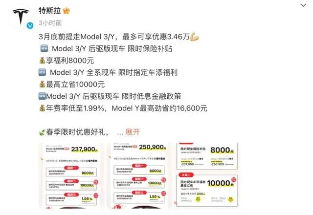 特斯拉也坐不住了,3月1日推出限时购车政策,最多可享3.46万元的优惠:Model3/Y后驱版现车限时保险补贴8000元;Model3/Y全系现车限时指定车漆福利,最高省1万元;Model3/Y后驱版现车限时低息金融政策,年费率低至1.99%。
