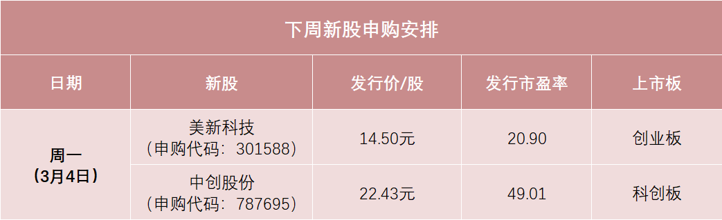 根据目前的新股发行安排,下周有两只新股申购。创业板新股美新科技、科创板新股中创股份都将在周一(3月4日)申购。