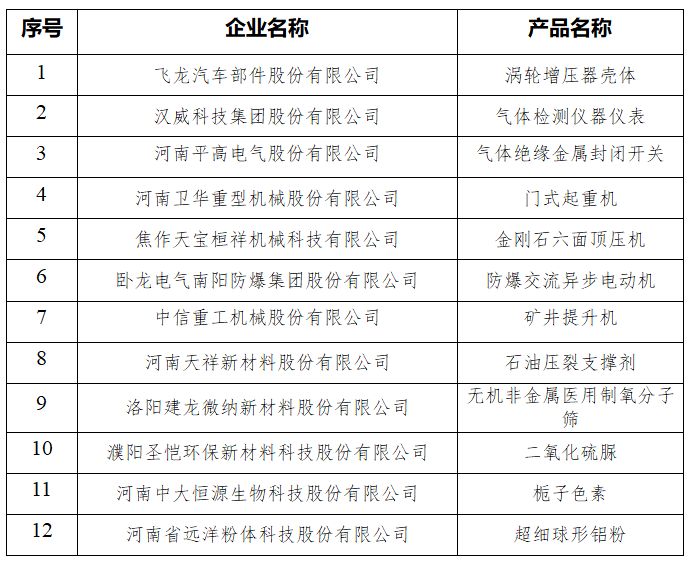 其中,第八批制造业单项冠军企业中,河南有12家企业上榜。分别为:飞龙汽车部件股份有限公司、汉威科技集团股份有限公司 、河南平高电气股份有限公司、河南卫华重型机械股份有限公司 门式起重机、焦作天宝桓祥机械科技有限公司、卧龙电气南阳防爆集团股份有限公司、中信重工机械股份有限公司、河南天祥新材料股份有限公司、洛阳建龙微纳新材料股份有限公司、濮阳圣恺环保新材料科技股份有限公司、河南中大恒源生物科技股份有限公司、河南省远洋粉体科技股份有限公司。