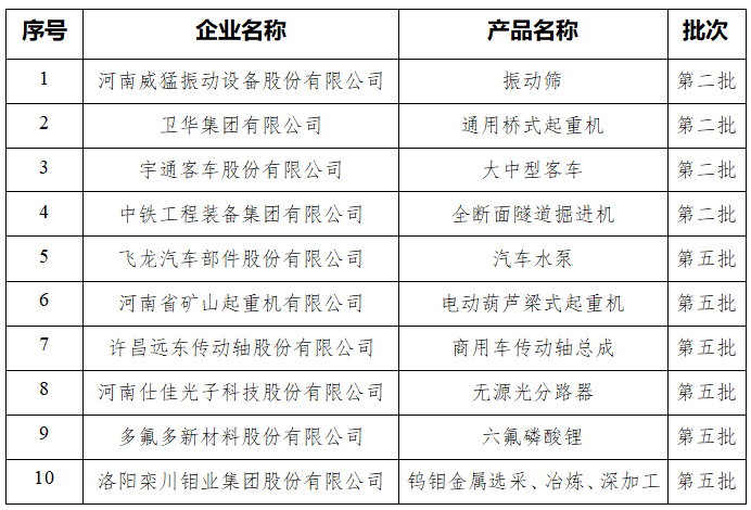 通过第二批、第五批制造业单项冠军企业复核的河南企业有10家。分别为,河南威猛振动设备股份有限公司、卫华集团有限公司、宇通客车股份有限公司、中铁工程装备集团有限公司、飞龙汽车部件股份有限公司、河南省矿山起重机有限公司、许昌远东传动轴股份有限公司、河南仕佳光子科技股份有限公司、多氟多新材料股份有限公司、洛阳栾川钼业集团股份有限公司。
