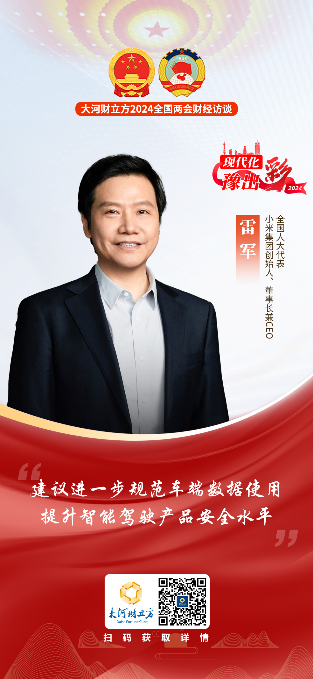 【大河财立方 记者 贾永标 上海报道】2024年两会期间,实业家的声音往往备受外界关注。3月4日,大河财立方记者从小米集团获悉,全国人大代表、小米集团创始人、董事长兼CEO雷军今年带来了4份建议。