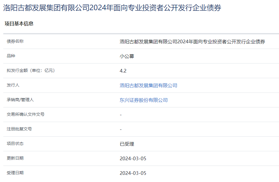 【大河财立方消息】3月5日,洛阳古都发展集团有限公司2024年面向专业投资者公开发行企业债券获上交所受理。该债券拟发行金额4.2亿元,承销商/管理人为东兴证券。本次债券发行期限不超过7年(含7年)。