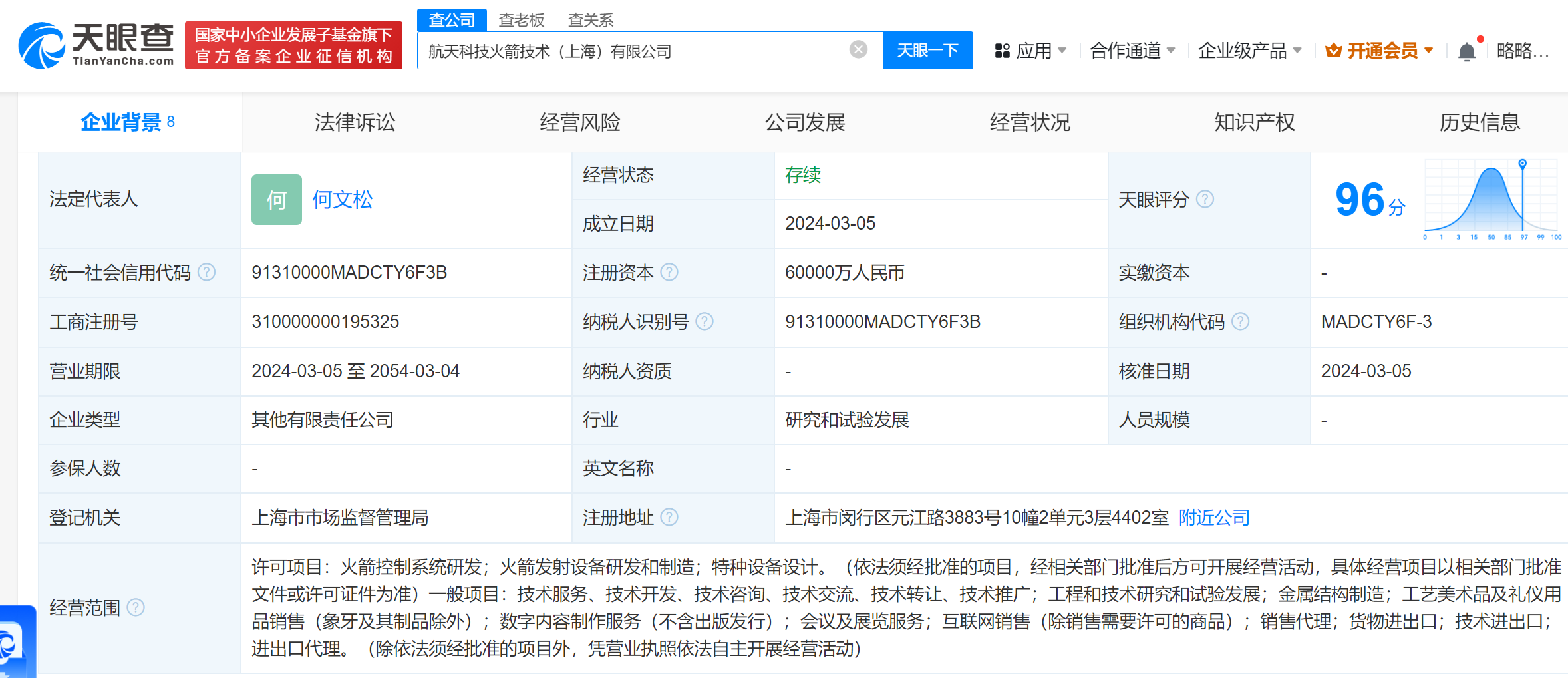 【大河财立方消息】天眼查App显示,近日,航天科技火箭技术(上海)有限公司成立,法定代表人为何文松,注册资本6亿人民币,经营范围含火箭控制系统研发、火箭发射设备研发和制造、特种设备设计、数字内容制作服务等。