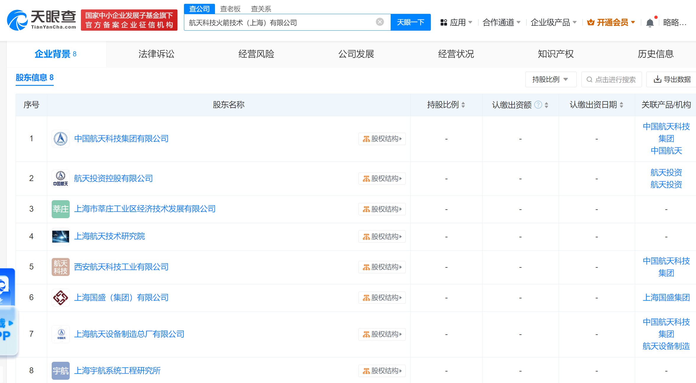 股东信息显示,该公司由中国航天科技集团有限公司和旗下上海航天设备制造总厂有限公司,以及上海国盛(集团)有限公司、上海市莘庄工业区经济技术发展有限公司等共同持股。