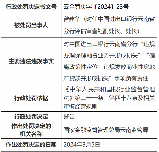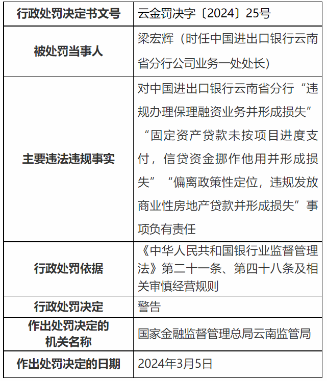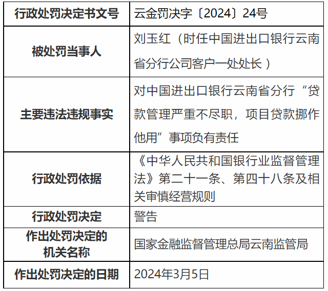 时任中国进出口银行云南省分行副行长苗泽林,时任中国进出口银行云南省分行副行长田灿钧,时任中国进出口银行云南省分行行长助理黄旭华,时任进出口银行云南省分行评估审查处副处长、处长曾建华,时任公司客户一处处长刘玉红、时任公司业务一处处长梁宏辉分别受到警告处分。