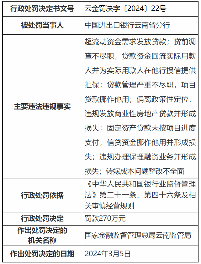 【大河财立方消息】3月11日,国家金融监督管理总局云南监管局披露的行政处罚信息显示,中国进出口银行云南省分行因超流动资金需求发放贷款等,被罚款270万元。