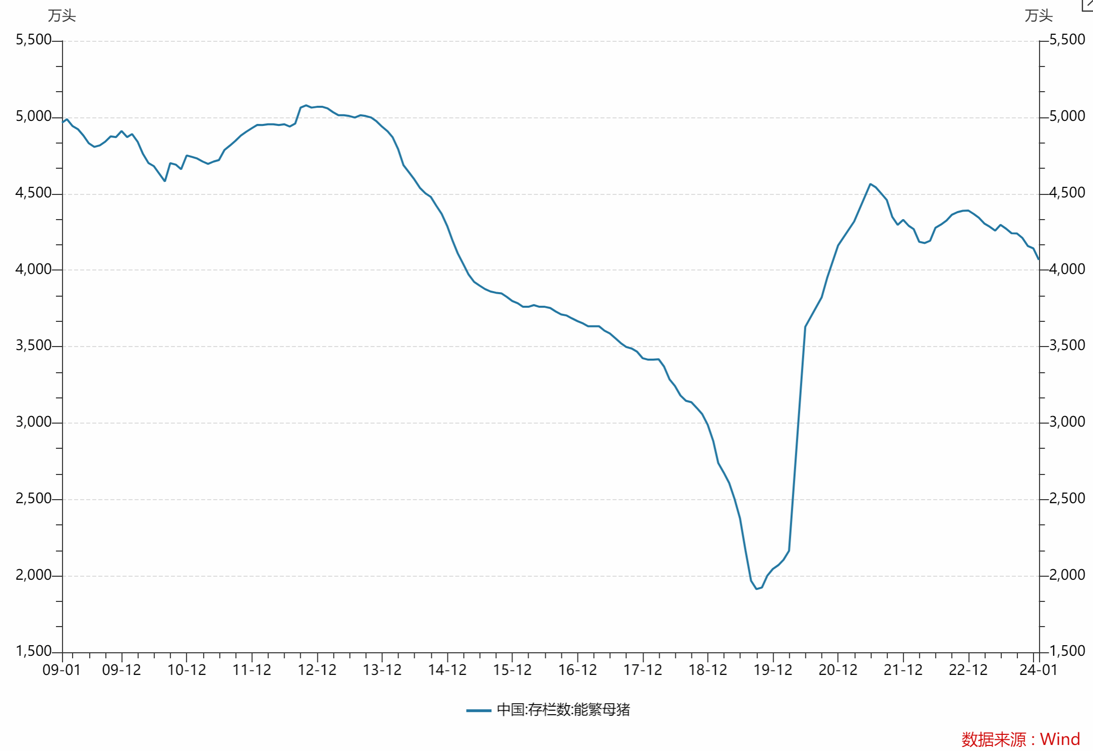 从能繁母猪的角度看,近期,能繁母猪的数量处于缓慢下降的趋势当中,但仍然处于相对高位。据Wind数据,今年1月末,我国能繁母猪存栏量为4067万头。