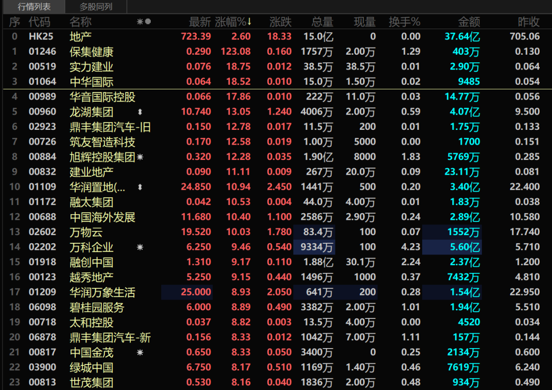 港股市场上,地产股的表现亦非常抢眼。龙湖集团大涨超13%,万物云、万科企业大涨超9%,融创中国、越秀地产、碧桂园服务、绿城中国等皆出现明显涨幅。