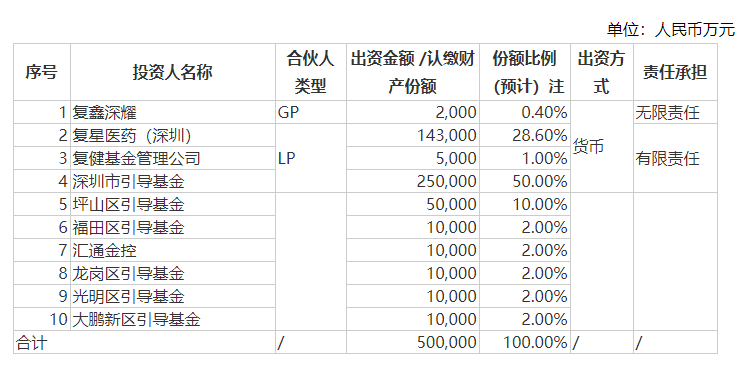 其中:复鑫深耀(作为GP)、复星医药(深圳)(作为LP)、复健基金管理公司(作为LP)拟分别以现金出资2000万元、14.3亿元、5000万元认缴目标基金中的等值财产份额。