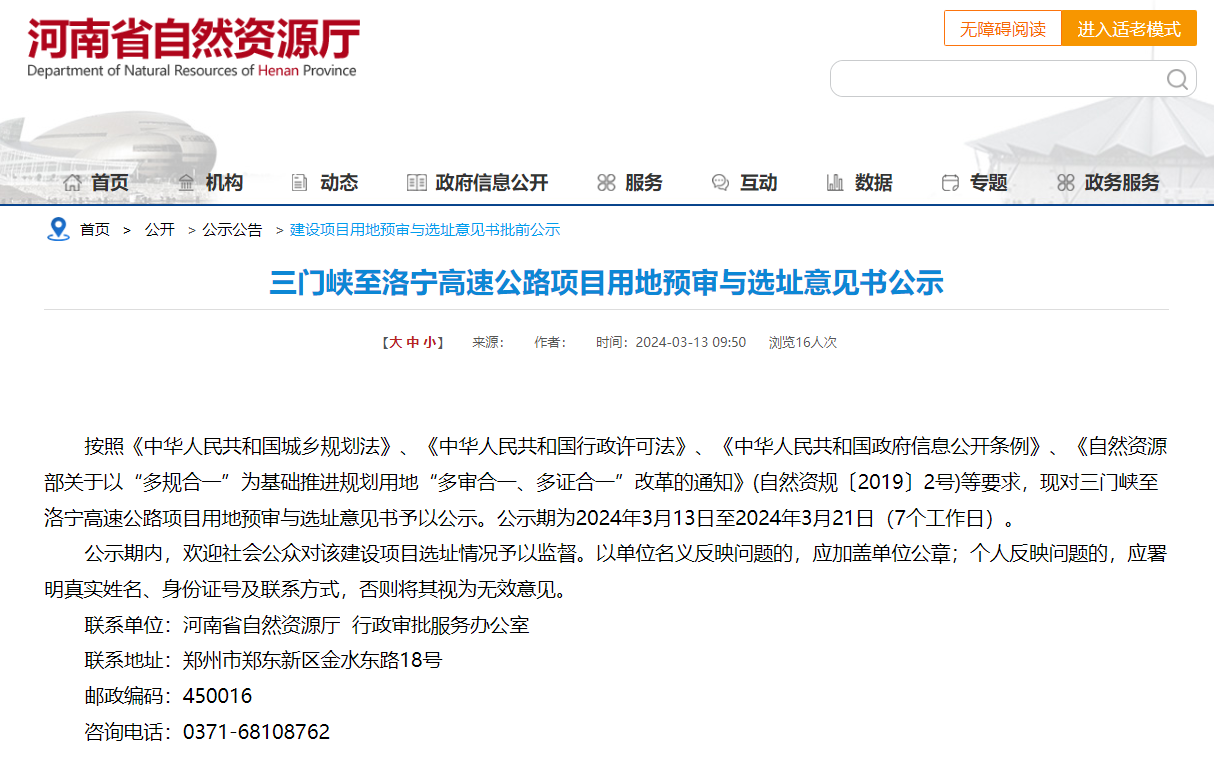 【大河财立方消息】3月12日,河南省自然资源厅对三门峡至洛宁高速公路项目用地预审与选址意见书进行公示,公示期为2024年3月13日至2024年3月21日。
