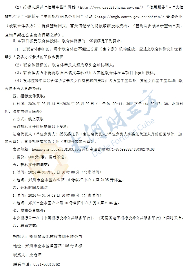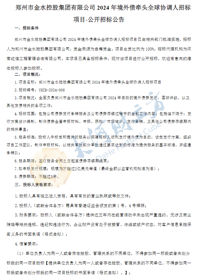 【大河财立方消息】3月14日消息,郑州市金水控股集团就2024年境外债牵头全球协调人项目公开招标。