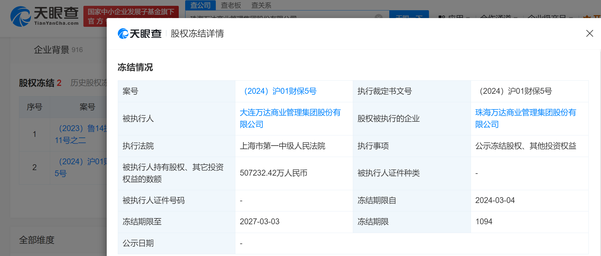 【大河财立方消息】天眼查App显示,近日,珠海万达商业管理集团股份有限公司新增一则股权冻结信息,被执行人为大连万达商业管理集团股份有限公司,冻结股权数额约为50.7亿人民币,执行法院为上海市第一中级人民法院,冻结期限自2024年3月4日至2027年3月3日。值得一提的是,上述约50.7亿人民币股权曾于去年7月被冻结,不久后解冻。