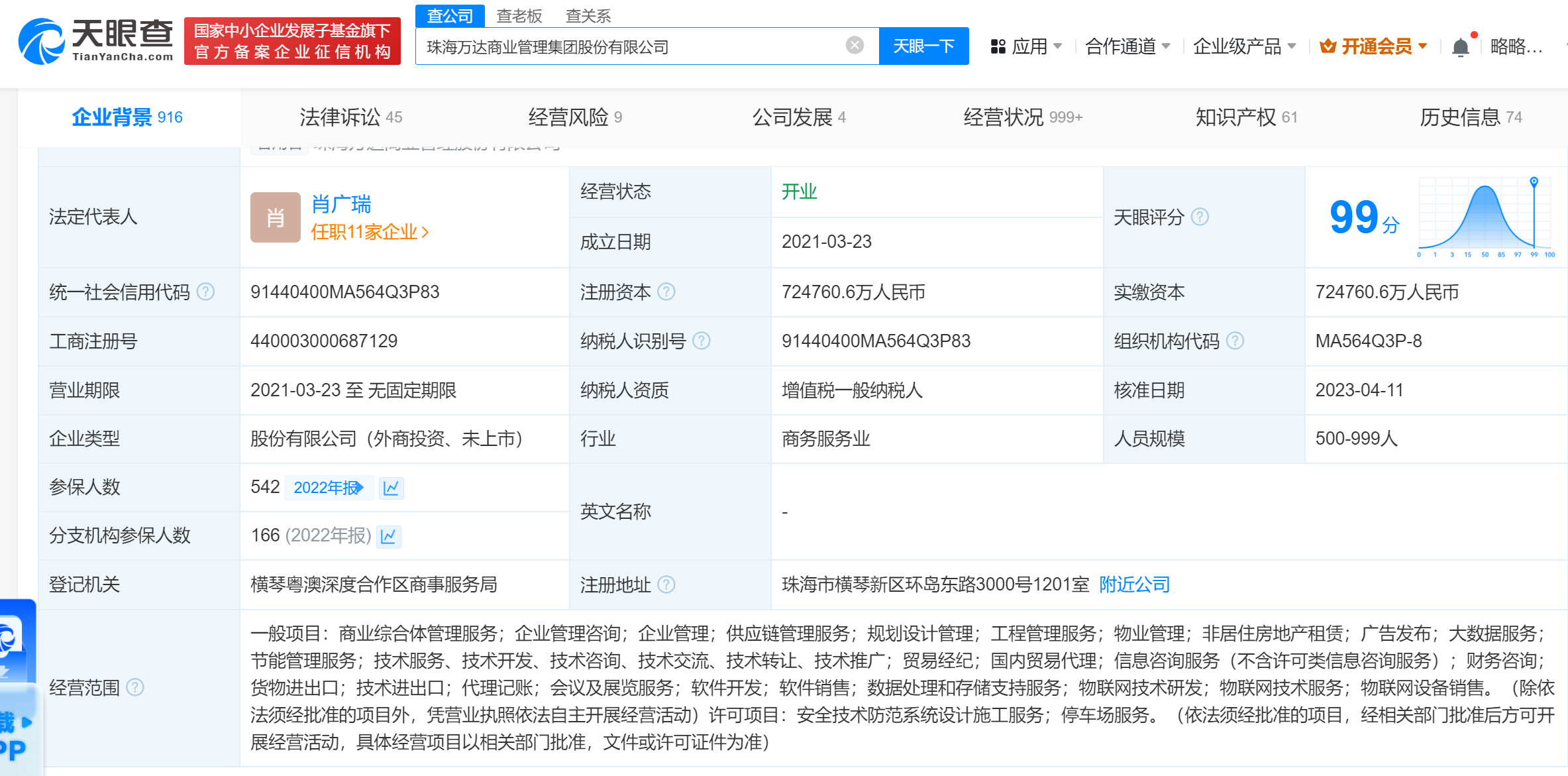 珠海万达商业管理集团股份有限公司成立于2021年3月,法定代表人为肖广瑞,注册资本约72.48亿人民币,由大连万达商业管理集团股份有限公司等共同持股,其中大连万达商业管理集团股份有限公司持股约70.15%,认缴出资额约50.7亿人民币。