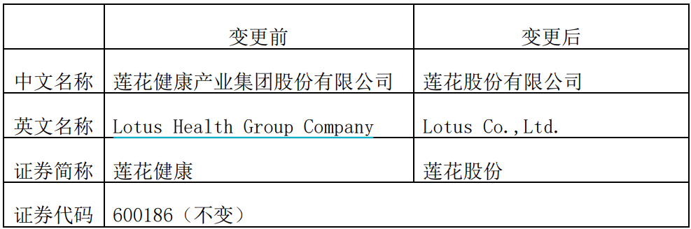 公告显示,莲花健康拟将中文名称变更为:莲花股份有限公司,英文名称变更为Lotus Co.,Ltd.;证券简称变更为莲花股份;证券代码则保持不变。