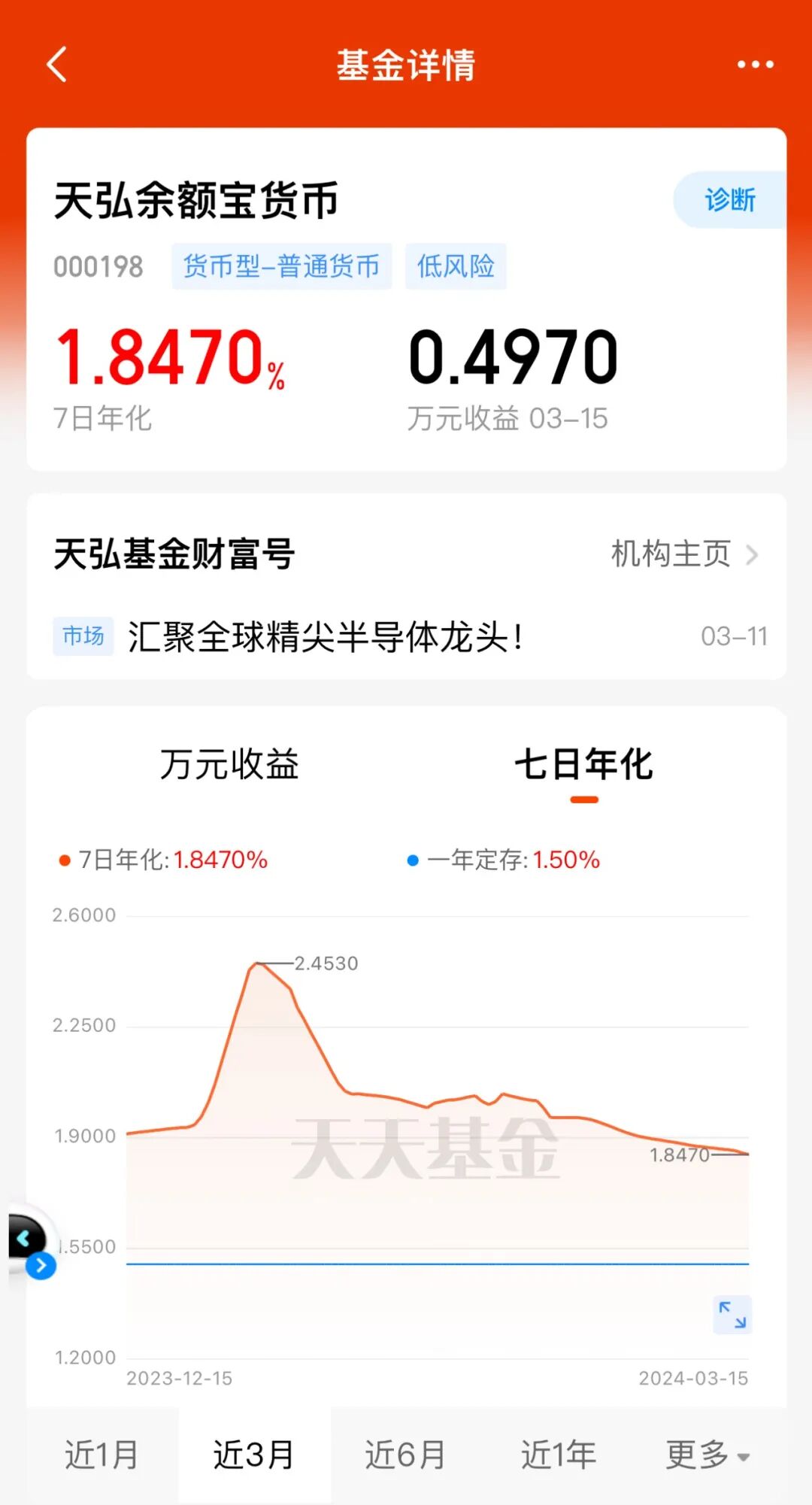 Wind数据显示,截至3月15日,全市场货币型基金平均7日年化收益率为1.95%,已经跌破了2%关口。这一数据和元旦前后2.42%的平均水平相比,已经回落了47个BP。