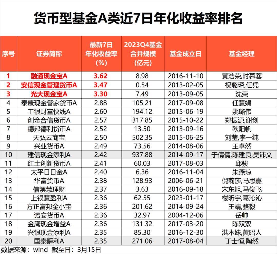 但也有部分货基逆势斩获不错的回报,比如融通现金宝、安信现金管理货币、光大现金宝等,最新7日年化收益率都在3%以上。