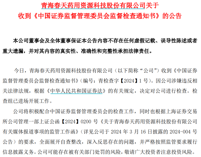 因青海春天涉嫌违反相关法律法规,3月16日,证监会决定对公司进行检查,检查组已进场开展工作。