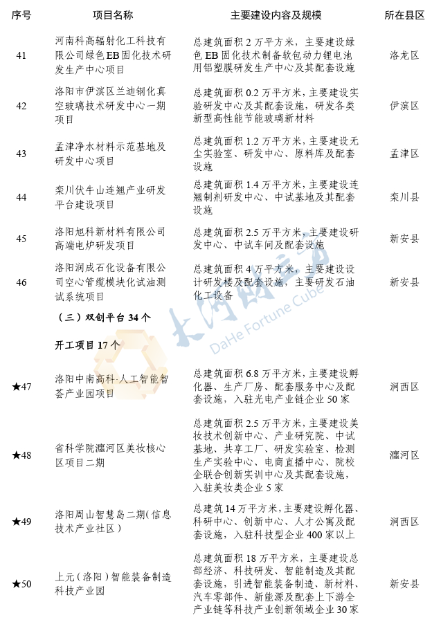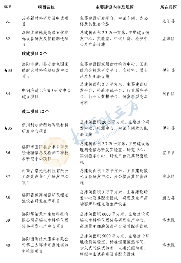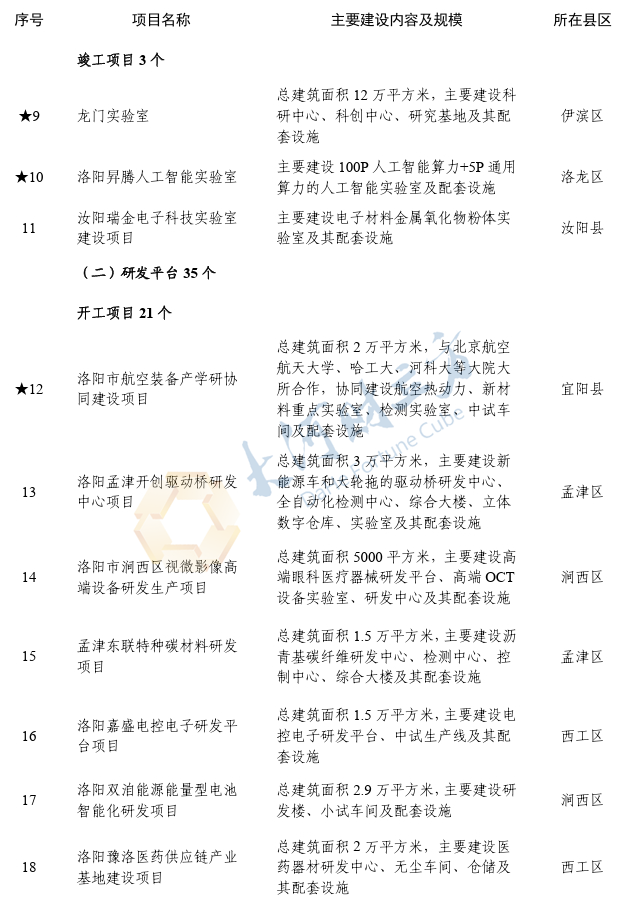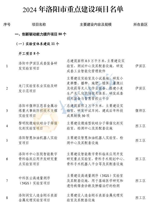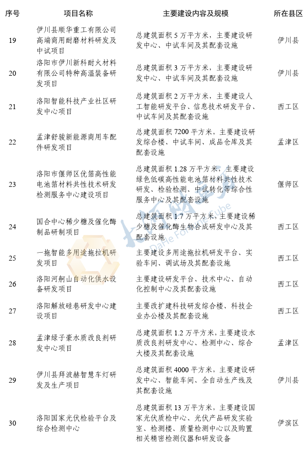 项目包括洛阳智慧加油机器人实验室项目、龙门实验室农业实验及研发示范项目、洛阳双洎能源能量型电池智能化研发项目、洛阳豫洛医药供应链产业基地建设项目等。