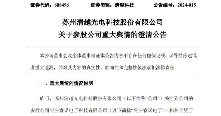 在这起事件中,涉事方枣庄睿诺电子科技有限公司(简称“枣庄睿诺电子”),是上市公司清越科技(688496)的参股企业。3月20日晚间,清越科技发布澄清公告称,本次参股公司纠纷内容所涉及之上下游客户及供应商与清越科技均无任何业务往来,“公司并未参与本事项的决策及实施过程。”