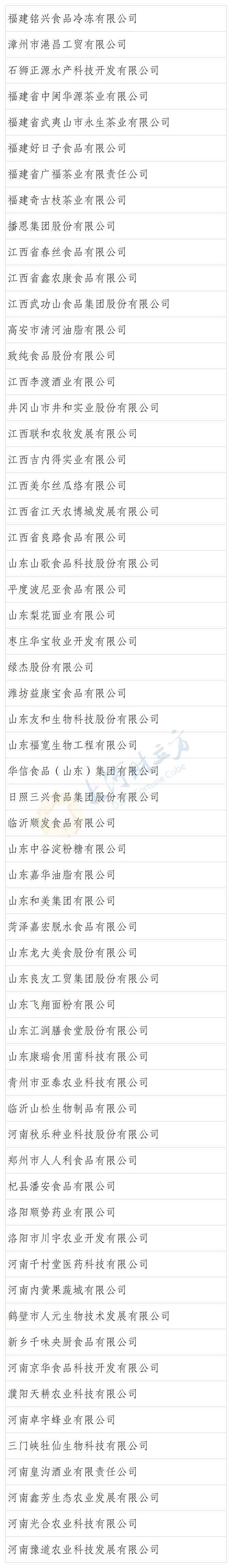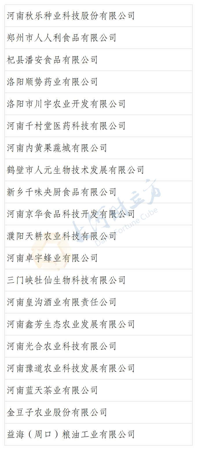 其中,河南秋乐种业科技股份有限公司、郑州市人人利食品有限公司、新乡千味央厨食品有限公司、河南豫道农业科技发展有限公司等20家河南企业在列。