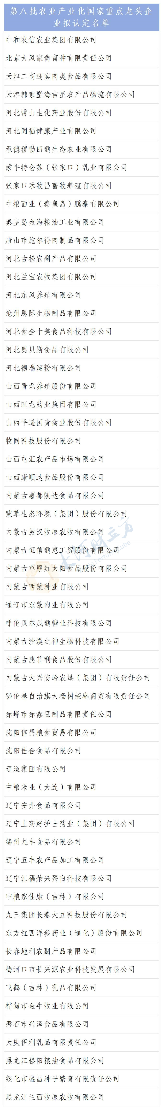 【大河财立方消息】3月22日消息,农业农村部公示第八批农业产业化国家重点龙头企业认定名单。经各省(区、市)遴选推荐、专家评审和全国农业产业化联席会议审定,拟认定中和农信农业集团有限公司等333家企业为农业产业化国家重点龙头企业。