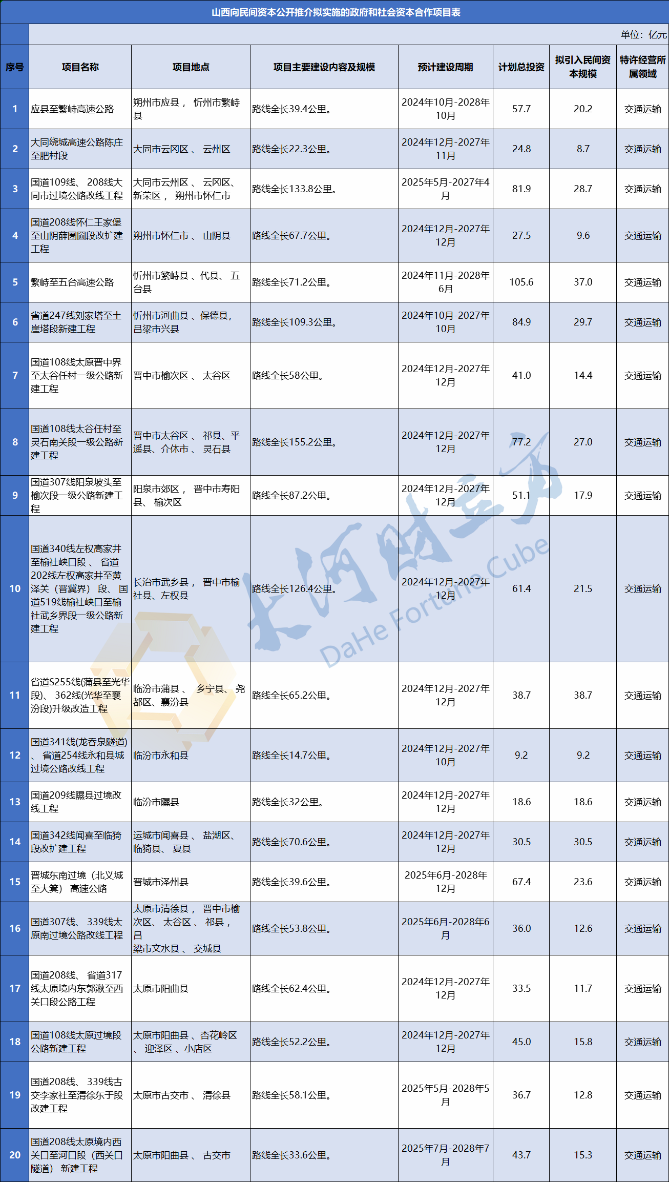 【大河财立方消息】3月26日消息,山西省发展改革委会同省交通运输厅和相关市,近日遴选了60个拟实施的政府和社会资本合作项目,向民间资本公开推介。