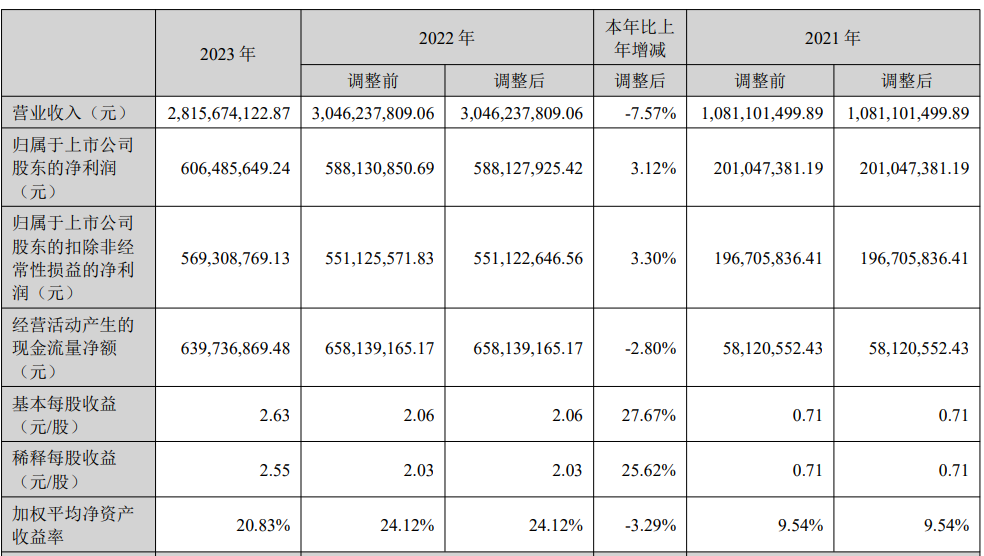 【大河财立方消息】3月26日,瑞丰新材发布2023年年度报告。公司全年实现营业收入为28.16亿元,较上年同期下降7.57%;实现归属于上市公司股东净利润6.06亿元,较上年同期增长3.12%。