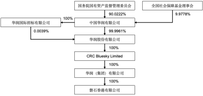 据公告显示,中国华润的股东分别为国务院国有资产监督管理委员会、全国社会保障基金理事会,持股比例分别为90.02%、9.98%。
