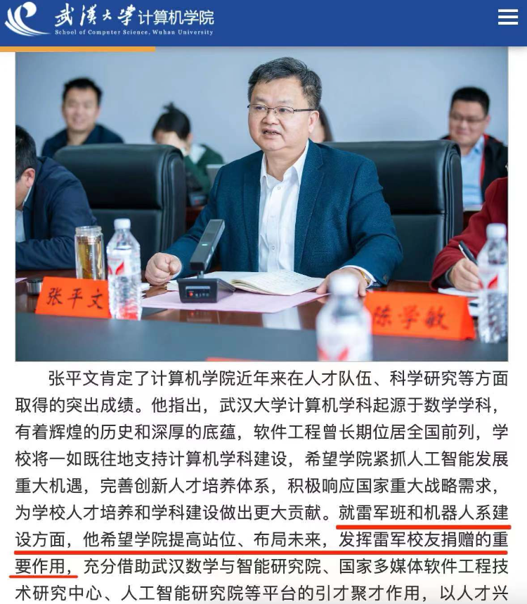 3月25日,武汉大学官网对校长张平文调研计算机学院进行了报道,文章提到:“就雷军班和机器人系建设方面,张平文希望学院提高站位、布局未来,发挥雷军校友捐赠的重要作用,凝心聚力早日把计算机学院建成国内知名、世界一流的学术高地。”