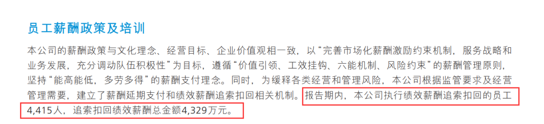 招商银行在年报中提到,公司的薪酬政策与文化理念、经营目标、企业价值观相一致,以 " 完善市场化薪酬激励约束机制,服务战略和业务发展,充分调动队伍积极性"为目标,遵循 "价值引领、工效挂钩、六能机制、风险约束"的薪酬管理原则,坚持"能高能低,多劳多得" 的薪酬支付理念。同时,为缓释各类经营和管理风险,本公司根据监管要求及经营管理需要,建立了薪酬延期支付和绩效薪酬追索扣回相关机制。报告期内,公司执行绩效薪酬追索扣回的员工有4415人,追索扣回绩效薪酬总金额4329万元。