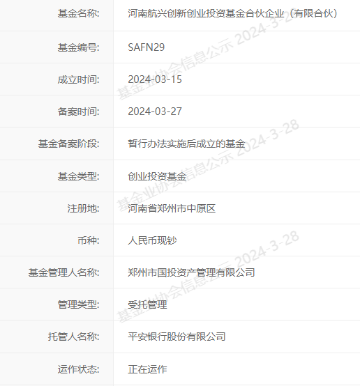 【大河财立方消息】3月28日消息,河南航兴创新创业投资基金合伙企业(有限合伙)已在中基协完成备案。