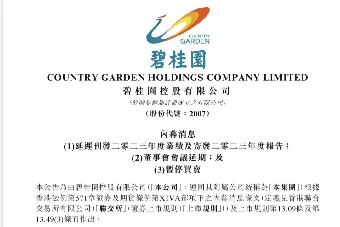 【大河财立方消息】3月28日晚间,碧桂园发布内幕消息公告称,公司延迟刊发2023年度业绩及寄发2023年度报告。同时,该公司将于4月2日起暂停在联交所买卖。