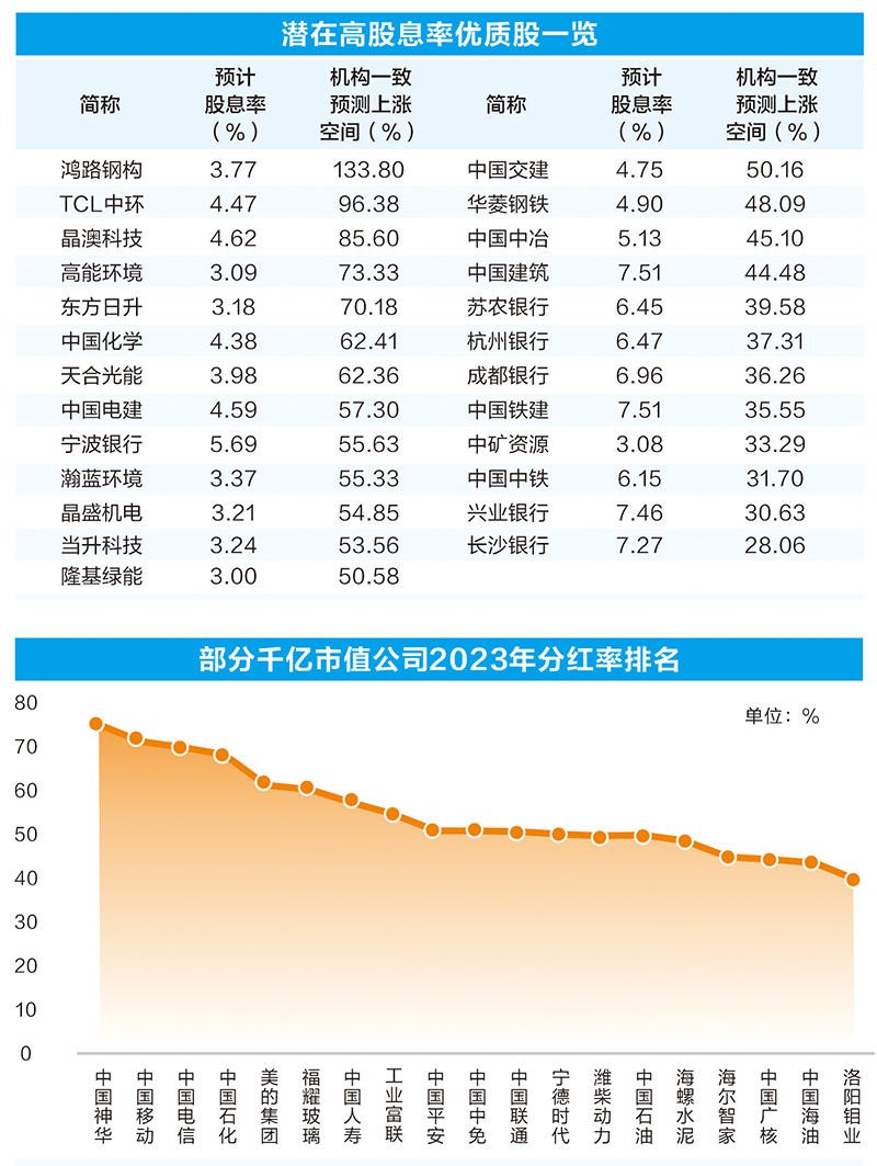 其中的典型代表是平安银行,公司此前分红率一直保持在20%以下,2023年分配预案为每10股派7.19元(含税),分红率提升至30%以上,创下2003年以来新高。除平安银行外,有色龙头洛阳钼业分红率由2022年的30%提升至2023年的40%;燃气龙头新奥股份分红率由2022年的27%提升至2023年的近40%;中药龙头华润三九分红率由2022年的40%提升至2023年的近52%等。
