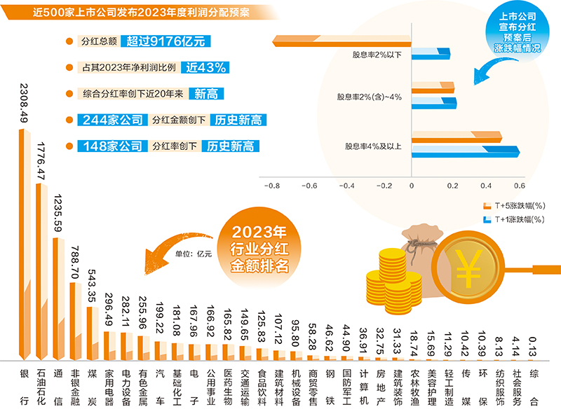整体来看,上述近500家上市公司2023年分红金额合计超过9176亿元(加上一季度、半年度和三季度分红),占其2023年净利润比例接近43%,综合分红率已创下近20年来新高。就上市公司自身而言,也有多达244家公司分红金额创下历史新高,占比接近一半;148家公司分红率创下历史新高,占比近三成。
