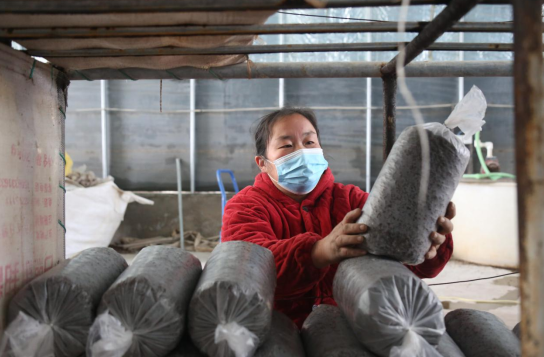 存平蘑菇种植合作社工作人员正在检查菌棒质量。汤凤军摄