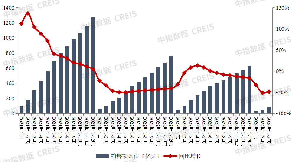图:2021年至2024年3月TOP100房企累计销售额均值及增速情况