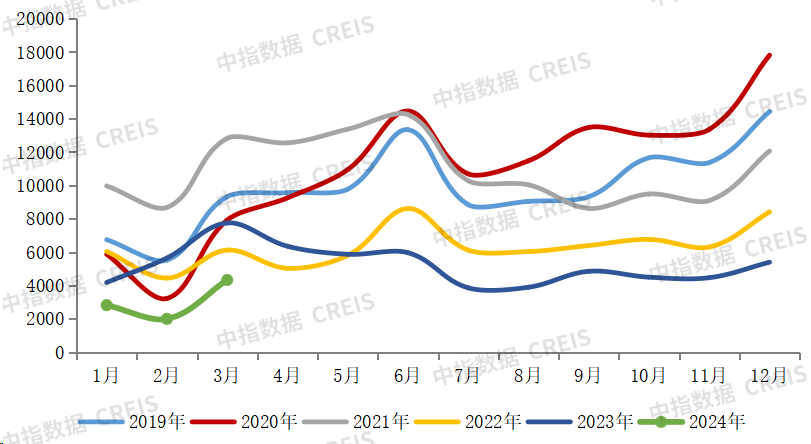 图:2019年至2024年3月TOP100房企单月销售额情况(单位:亿元)