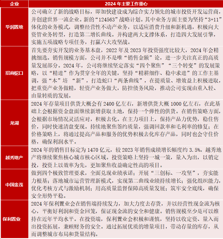 2024年3月,部分上市房企举行业绩发布会公示2023年年度业绩报告并公布2024年发展战略。投资策略方面,坚持精准投资、营销定投,继续聚焦核心城市核心区,以效率为先,更加关注收益确定性高的项目。经营策略方面,房企将聚焦好产品、好服务,坚持小批次开发,并针对中高端改善客户的需求快速迭代产品,同时房企基本提到了实施轻重并举战略,通过推动轻资产业务拓展,实现第二曲线业绩持续增长。